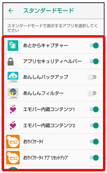 アプリごとに、スタンダードモードを利用するかどうかを設定します。