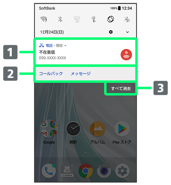 - 通知によって利用できる機能は異なります。たとえば着信の通知では、着信のあった電話番号に発信したり、SMSを送信できます。