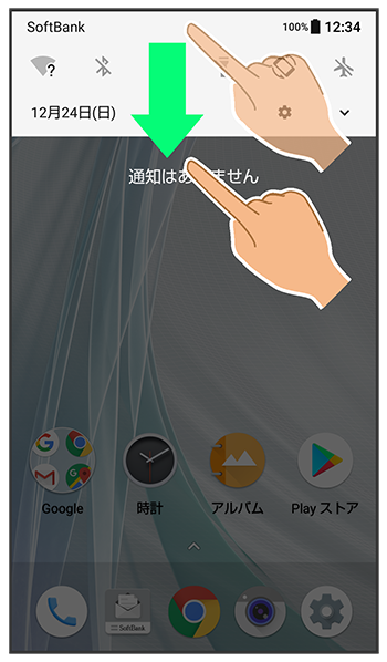 をタップしてもクイック設定パネルが表示されます。 - 通知パネルが開いてない状態で、ステータスバーを2本の指で下にドラッグしても、クイック設定パネルが表示されます。
