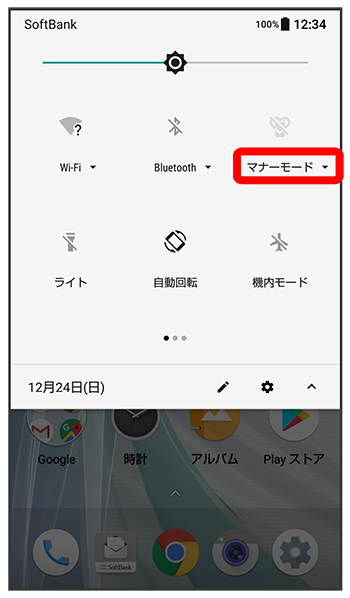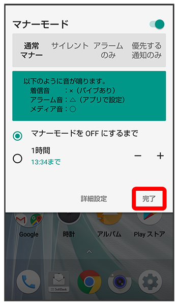 マナーモード設定画面で/をタップして解除するまでの時間を設定- をタップすると、手動で解除するまでマナーモードが有効になります。