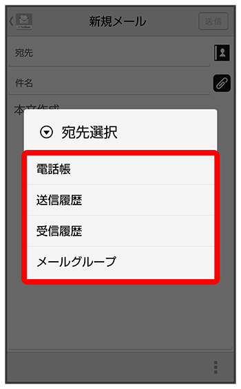 - //をタップすると、電話帳/送信履歴/受信履歴から宛先を選択できます。