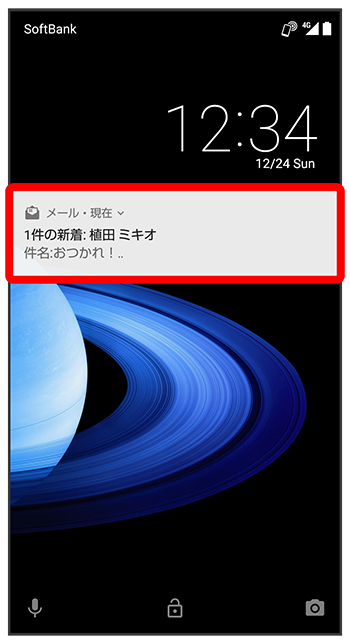 新着メールを受信すると、新着メッセージの通知と、通知アイコンが表示されます。