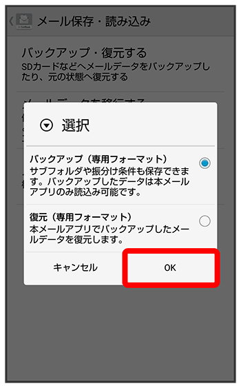 本体のメールデータをSDカードなどにバックアップします。