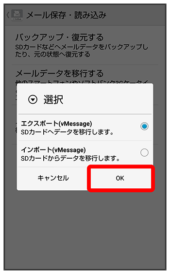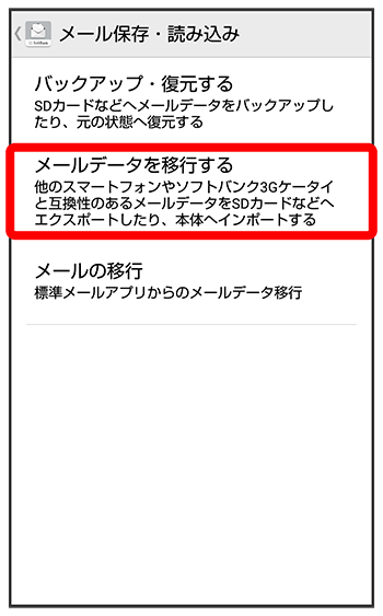 本体のメールデータをvMessage形式でSDカードなどにエクスポートします。vMessage形式は、ほかのスマートフォンやソフトバンク携帯電話(3G)と互換性があります。