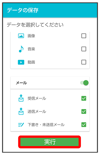 - 本体に保存されている受信メールデータ/送信メールデータ/下書き/未送信メールデータごとにエクスポートします。メールデータを1件ずつ選択して保存することはできません。