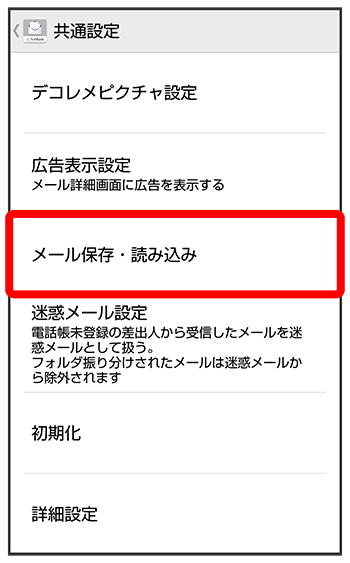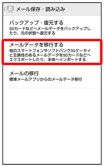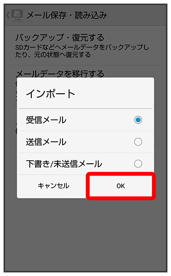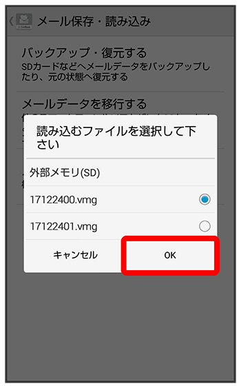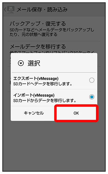 SDカードなどにエクスポートしたvMessage形式のメールデータを、本体にインポートします。