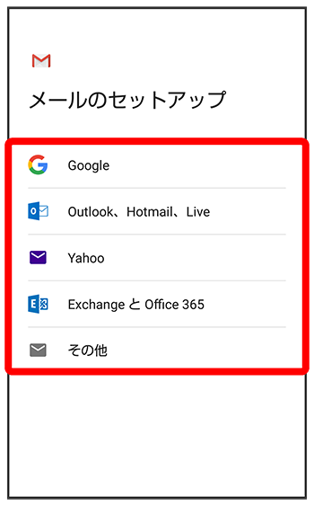 - すでにGoogle アカウントでログインしている場合は、アカウント設定画面は表示されません。別のアカウントを追加するときは、「アカウントを追加する」を参照してください。