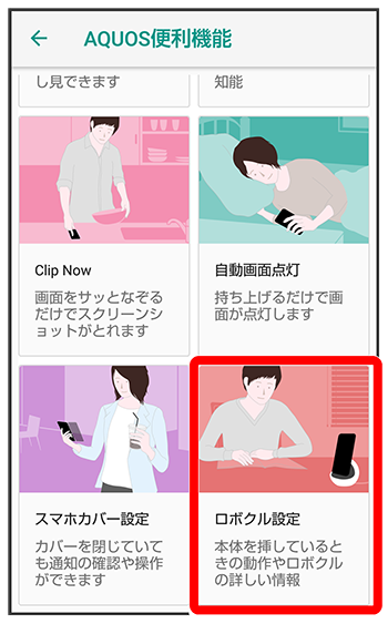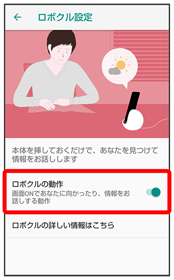 - 有効にすると、本機の電源が入っているとき、ロボクルで充電すると、ディスプレイ点灯時や充電開始、着信、アラームなどに連動してロボクルが回転します。