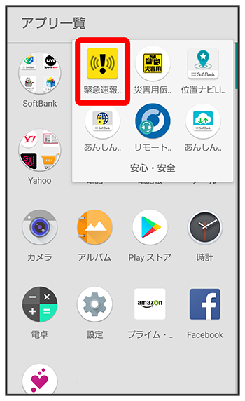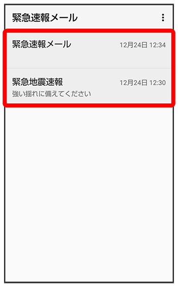 緊急速報メール受信メッセージ一覧画面が表示されます。