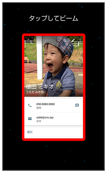 NFC対応機器同士を重ねるだけで、電話帳や写真などを転送することができます。
