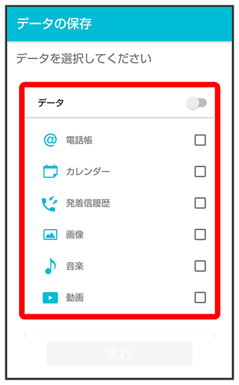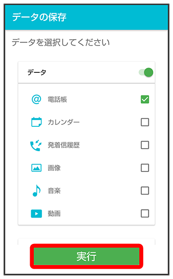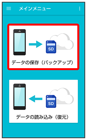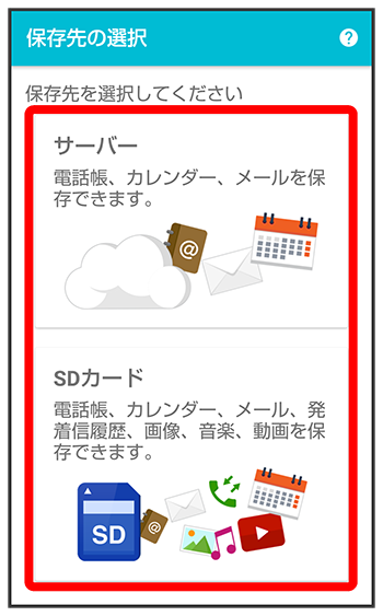 本体の電話帳データ/カレンダーデータ/発着信履歴データ/画像データ/音楽データ/動画データ/メールデータを、サーバー/SDカードに保存します。