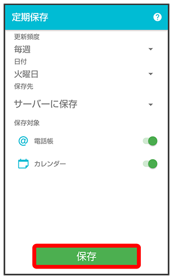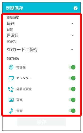 本体の電話帳データ/カレンダーデータ/発着信履歴データ/画像データ/音楽データ/動画データを、サーバー/SDカードに定期的に自動で保存します。