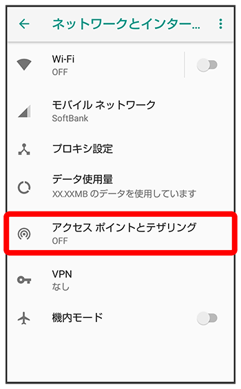 | Wi-Fiテザリングを設定 | ネットワーク名やセキュリティなど、Wi-Fiテザリングを利用する際の設定を行います。 |