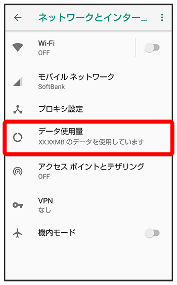 モバイルデータ通信の使用量(1ヶ月単位)を確認したり、使用を制限したりすることができます。
