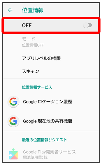 | スキャン | 位置情報の精度を向上させるためにWi-FiやBluetooth®のスキャンをするかどうかを設定します。 |