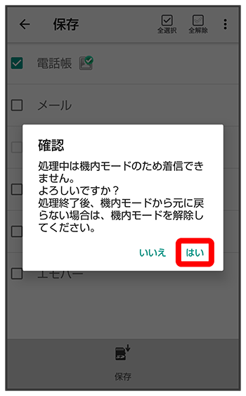 - メールのみを保存するときは、をタップすると、あんしんバックアップが起動します。メールを含む複数のデータを保存するときは、メール以外のデータを保存したあと、をタップするとあんしんバックアップが起動します。画面に従って操作してください。詳しくは、「あんしんバックアップを利用する」を参照してください。