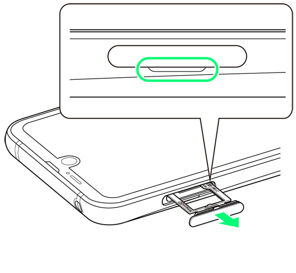 - ディスプレイを上にして、カードトレイを引き出してください。ディスプレイを下にしたり、本機を立てた状態でカードトレイを引き出すと、SIMカードやSDカードがカードトレイから外れ、紛失する可能性があります。