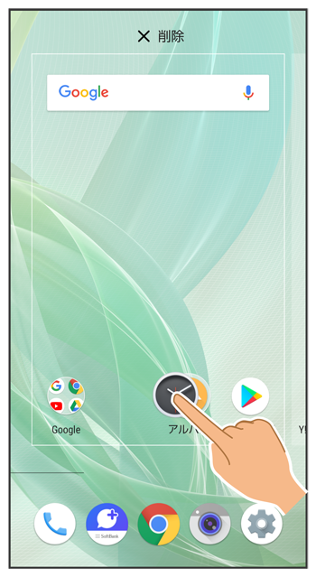 ホーム画面でフォルダをロングタッチ「削除」までドラッグ- お気に入りトレイでも同様に操作できます。