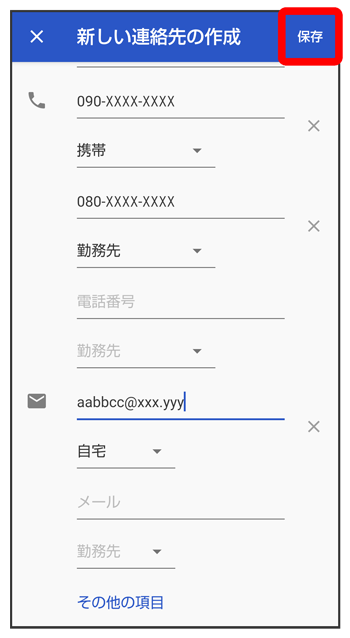 新しい連絡先の作成画面で登録する種別の- 「カスタム」を選択したときは、このあと種別名を入力と操作してください。