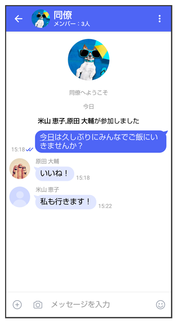 同じグループのメンバーに写真やスタンプなどが共有できます。
