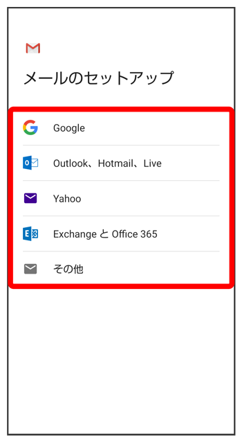 - すでにGoogle アカウントでログインしている場合は、アカウント設定画面は表示されません。別のアカウントを追加するときは、「アカウントを追加する」を参照してください。