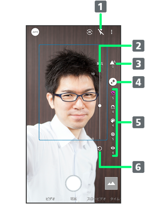 フラッシュの代わりに画面全体が発光し、夜の自撮りでも人物が明るく撮れます。 - 調節バー1