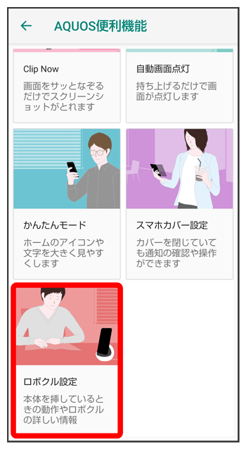 - 有効にすると、本機の電源が入っているとき、ロボクルで充電すると、ディスプレイ点灯時や充電開始、着信、アラームなどに連動してロボクルが回転します。