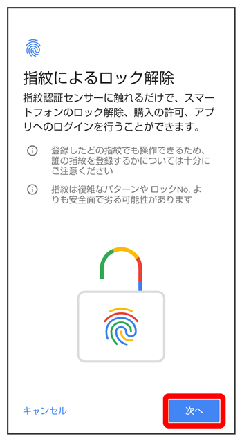 画面に従って画面ロック解除用のパターン/ロックNo.(PIN)/パスワードを設定