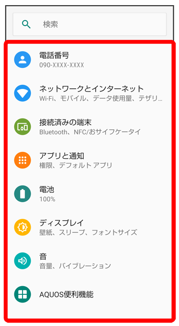 | ネットワークとインターネット | Wi-Fiやモバイルネットワーク、データ使用量など、ネットワークやインターネットに関する設定ができます。 |
