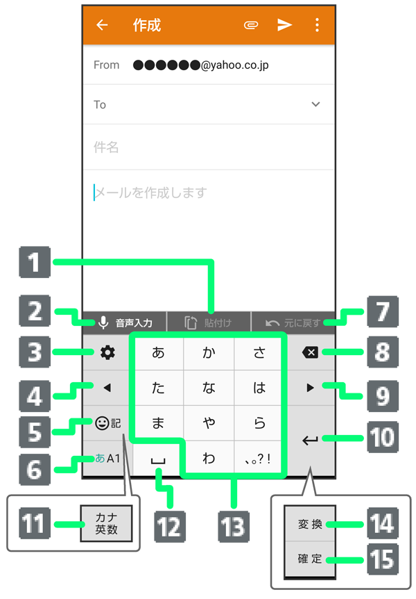 - カーソルを左に移動(上下右にフリックすると、カーソルを上下右に移動。文字入力中は、変換の区切りを変更)