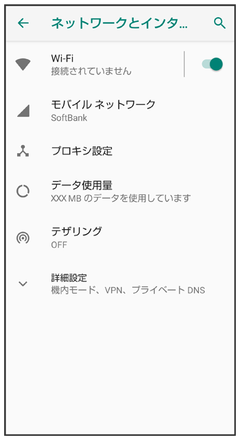 | モバイルネットワーク | が追加され、モバイルデータを利用するかどうかを設定できます。 がに変更されます。 が追加され、アプリごとのモバイルデータ使用量を確認できます。 が、に変更されます。を無効( |