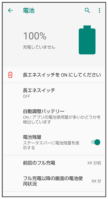 | XX% | 電池残量と電池の状態などを確認できます。 、は削除されます。 |