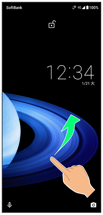 が表示されているときは、画面を上にフリックしたあとパターン/ロックNo.(PIN)/パスワードを入力してロックを解除する操作が必要です。