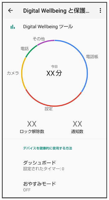 画面ロックを解除した回数や受信した通知の件数を表示したり、アプリごとにタイマーを設定できるなど、本機の使いすぎを抑制します。設定できる項目は次のとおりです。
