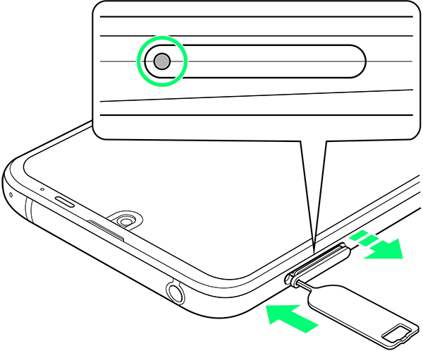 ディスプレイを上にして、カードトレイ取り出し用の穴に、SIM取り出しツールの先を差し込む