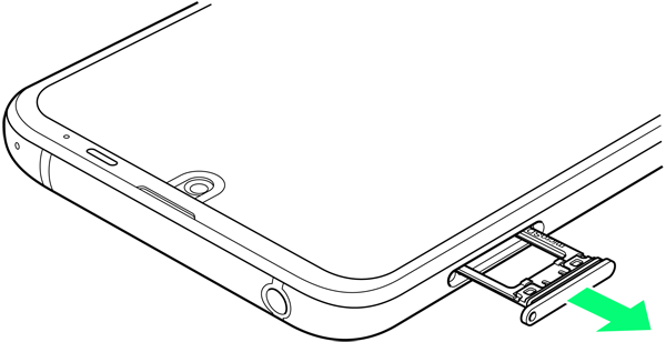 - ディスプレイを上にして、カードトレイを引き出してください。ディスプレイを下にしたり、本機を立てた状態でカードトレイを引き出すと、SIMカードやSDカードがカードトレイから外れ、紛失する可能性があります。