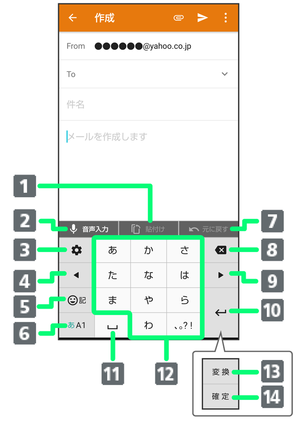 - 絵文字/記号/顔文字を入力(右にフリックすると、アプリ連携・引用一覧を表示)