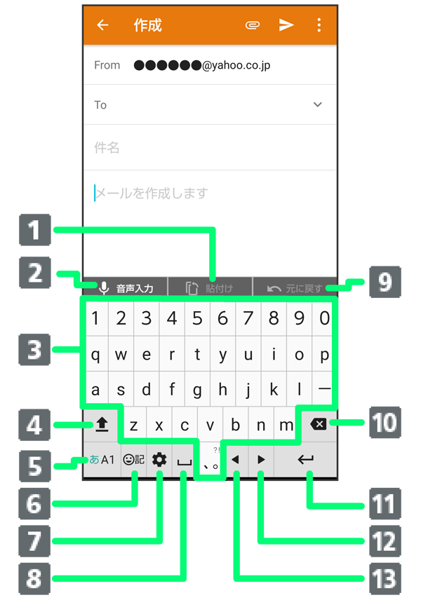 - 文字入力に関する設定項目を表示(上にフリックすると、12キーボードに切り替え。右にフリックすると、音声で文字を入力)