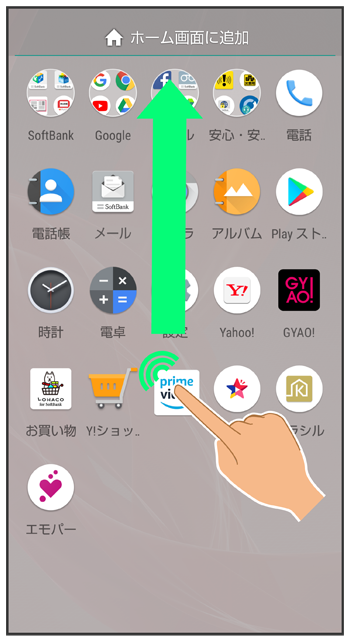 アプリ一覧画面でアプリをロングタッチし、「ホーム画面に追加」までドラッグ