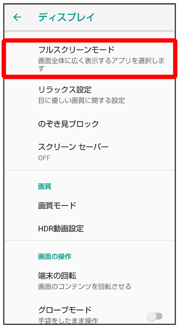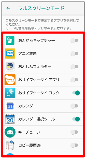 アプリごとに、フルスクリーンモードを利用するかどうかを設定します。