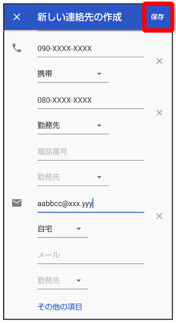 新しい連絡先の作成画面で登録する種別の- 「カスタム」を選択したときは、このあと種別名を入力と操作してください。