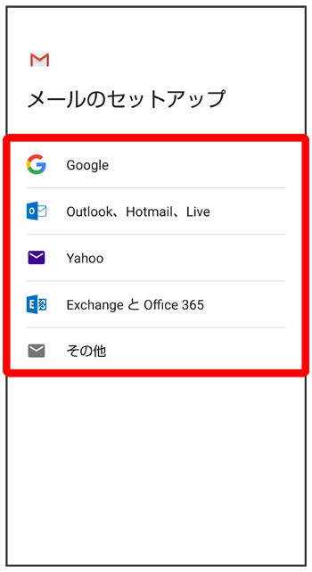 - すでにGoogle アカウントでログインしている場合は、アカウント設定画面は表示されません。別のアカウントを追加するときは、「アカウントを追加する」を参照してください。