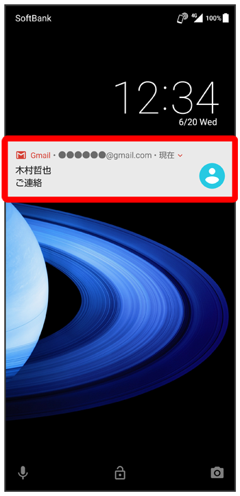 新着メールを受信すると、ロック画面に新着メッセージ通知が表示されます。