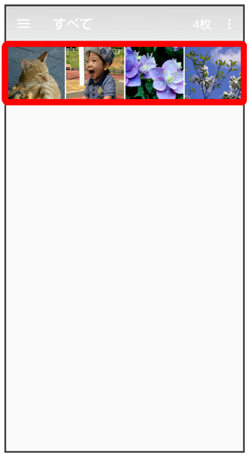- はじめてアルバムを起動したときは、の写真/動画一覧画面が表示されます。2回目以降は、前回終了時の画面(写真/動画一覧画面またはフォルダ画面)が表示されます。