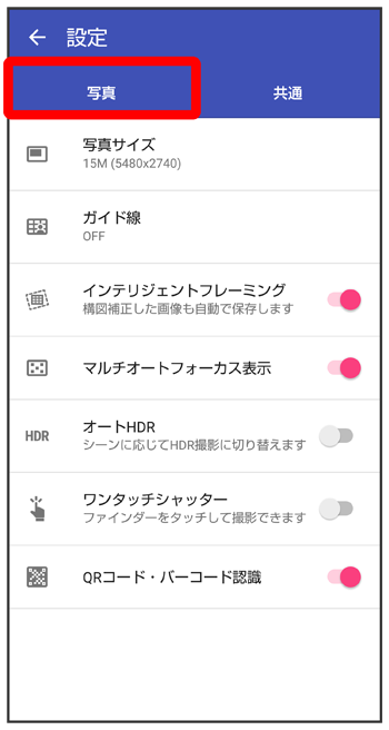 | オートHDR | 逆光などコントラストが強いシーンで、自動で白とび/黒つぶれを軽減して撮るかどうかを設定します。 |