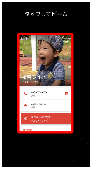 NFC対応機器同士を重ねるだけで、電話帳や写真などを転送することができます。