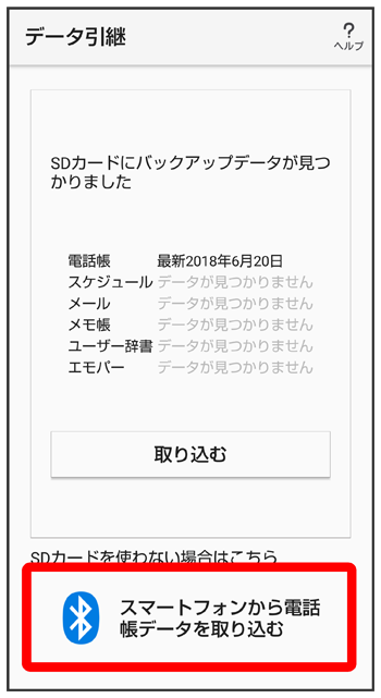 - SDカードが挿入されていないときや、SDカードにバックアップデータがないときは、取り込み元の携帯電話の選択画面が表示されます。画面に従って操作してください。