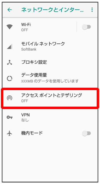 | Wi-Fiテザリングを設定 | ネットワーク名やセキュリティなど、Wi-Fiテザリングを利用する際の設定を行います。 |