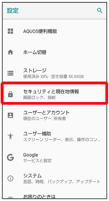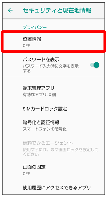 | 位置情報サービス | 位置情報を利用するアプリについて設定します。 |