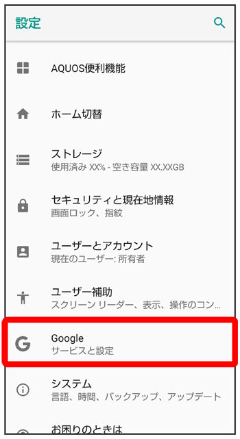 | Google アカウント | Google アカウントやログインとセキュリティなどについて設定します。 |